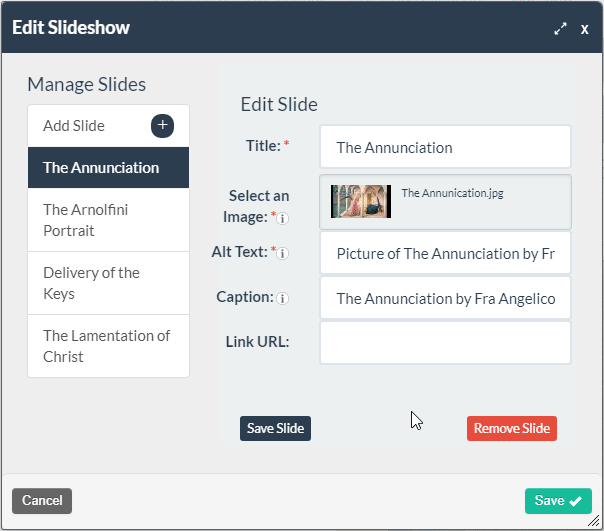 If a slide needs to be edited, click the slide title under Manage Slides. Make the required changes and click the Save Slide button. When slide editing is complete, click the Save✔ button to save all changes made to the Slideshow block.