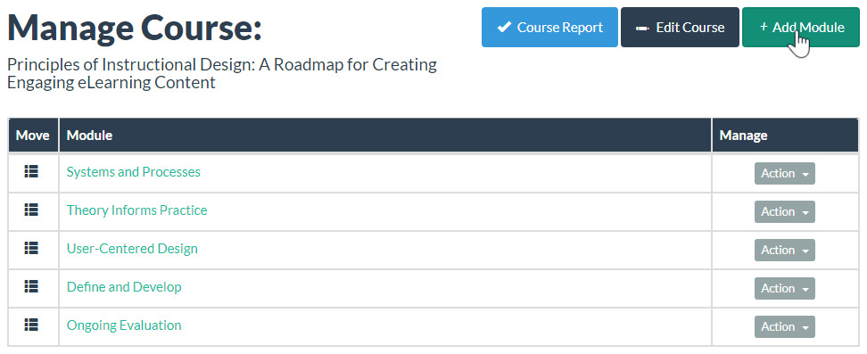 - From the Manage Course view, select the +Add Module button.