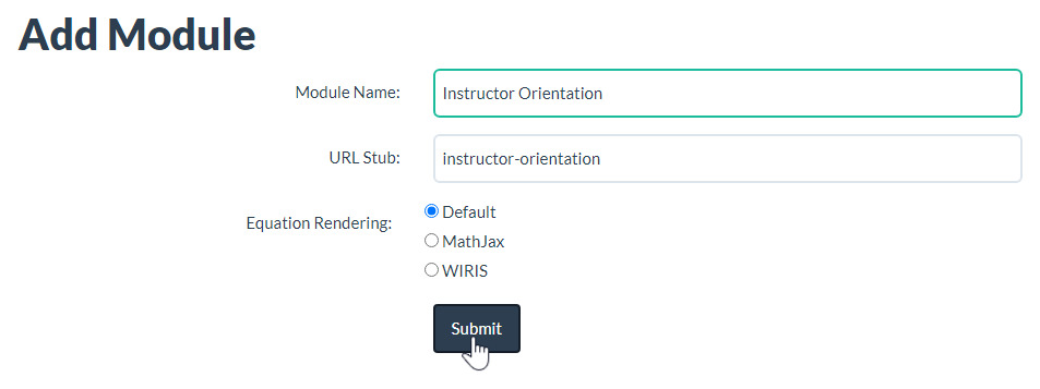 - Enter a name for the new module—the URL stub will be automatically generated—and select the Submit button.