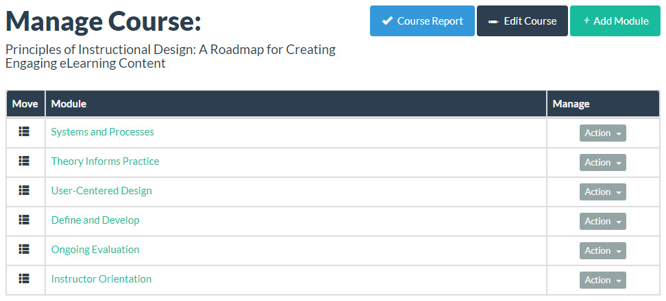 Note: For additional information about the Introduction, Overview, and Summary page templates; refer to What is a page template?. - To change the order of the modules in the course, click the move handle of a module and drag it to the appropriate position in the course.