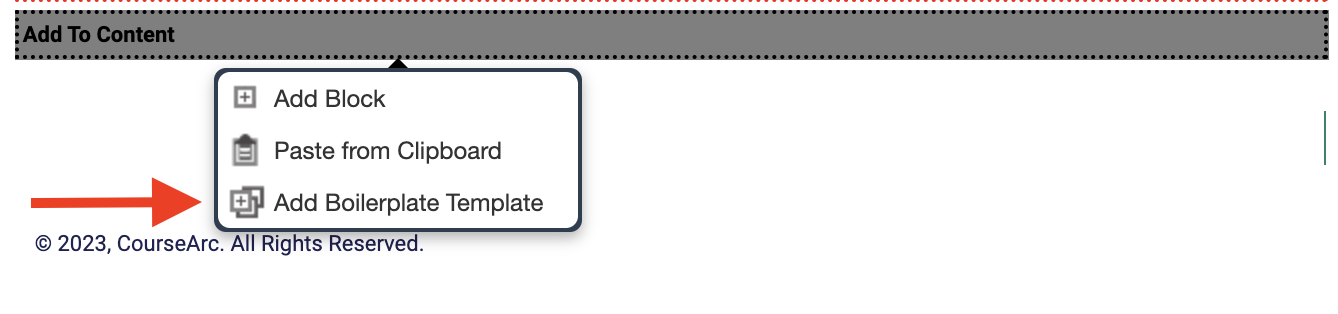 - Hover the cursor over the Add to Content block, click once, and select Add Boilerplate Template.