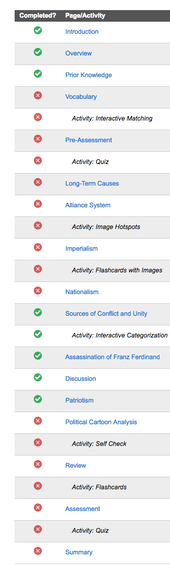Learner view for each page and activity of a course module in a participation course (See What's Left link)