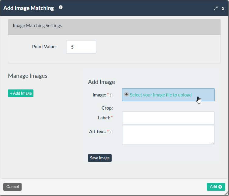 - The Add Image Matching form will appear. The Point Value: field will only be displayed if the module is being graded. As a default, the point value is set to 5. If needed, change the point value.