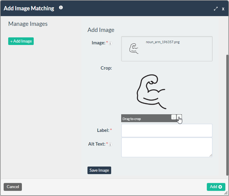 - Crop: When an image is added, the Crop field shows a preview of the image. All images are sized down to ensure proper viewing on mobile devices. Use the plus, minus, or move tools to adjust the image as needed.