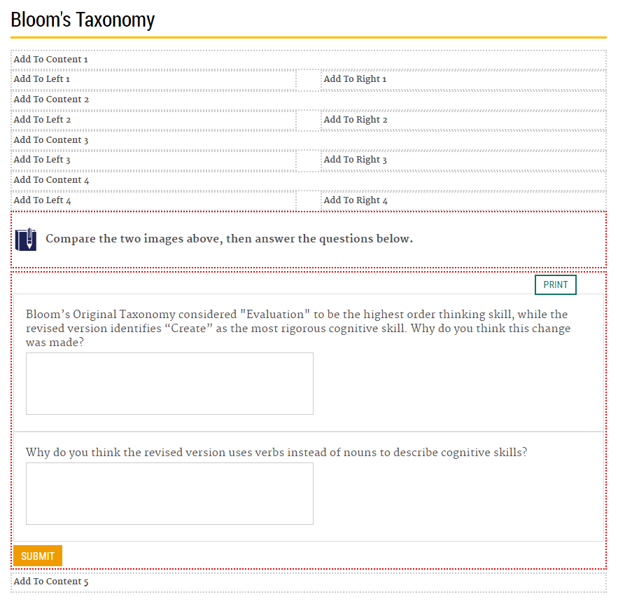- The page will appear as shown below with options to add blocks of content in single columns (e.g., Add to Content 1) and pairs of equal width columns (e.g., Add to Left 1 and Add to Right 1 ).