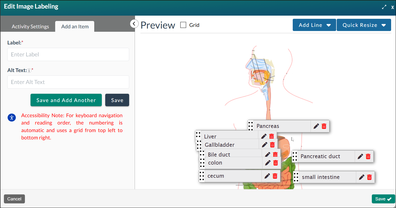 - Select the Image Labeling block. The Add Image Labeling form will open. The editor has two areas: the editing pane and the preview pane. Changes made in the editing pane will show in the preview pane so that the activity can be visualized as it is being built. The Image Labeling Block editor has two tabs: Activity Settings and Add an Item.