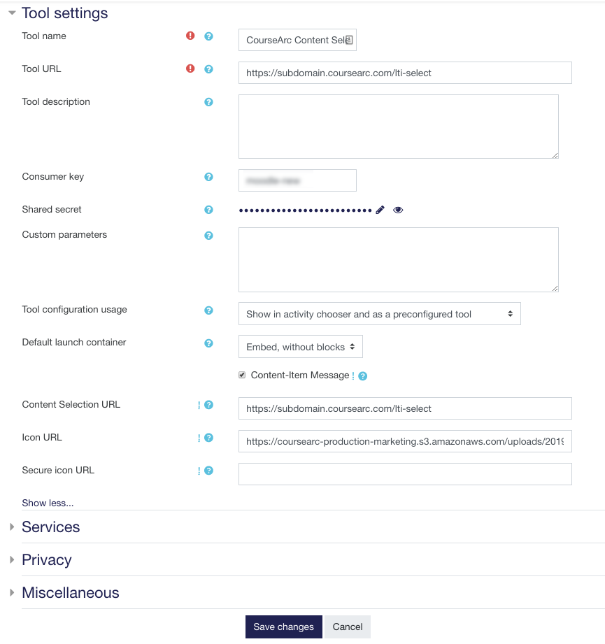 Tool name: Tool name should indicate that the content source is CourseArc (e.g., CourseArc Content Selector)