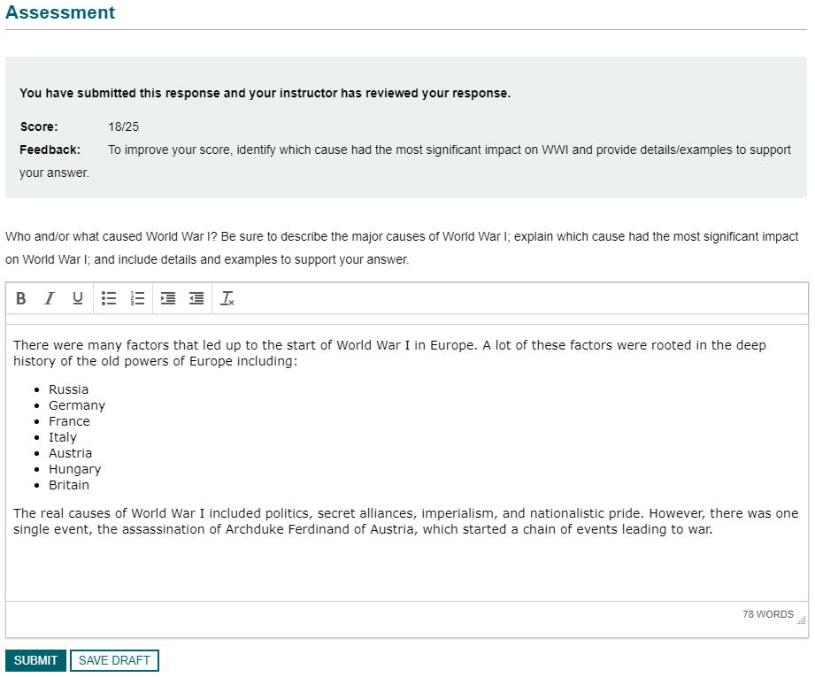 Note: In this example, the SUBMIT and SAVE DRAFT buttons are available because the instructor allowed a retry.