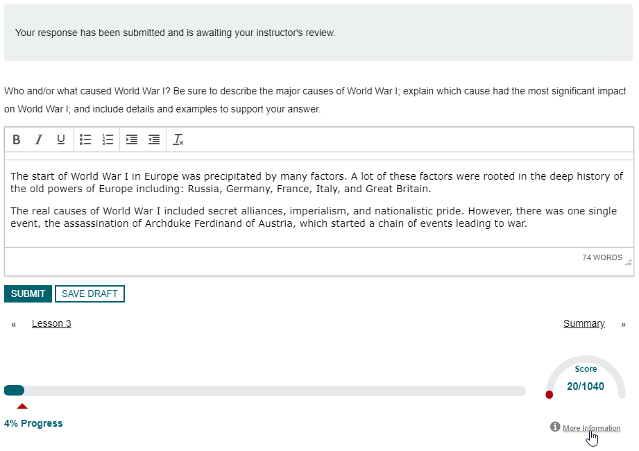 - When the instructor has graded the response, the course page will show the score and any feedback provided.
