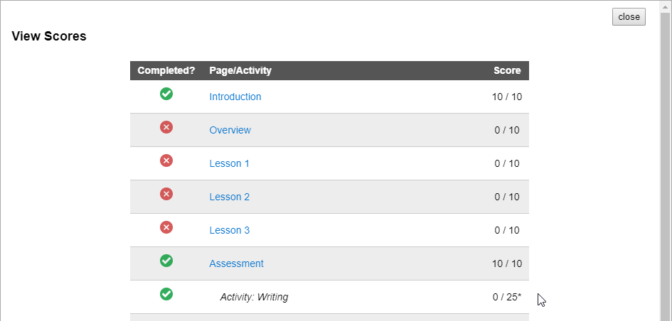 Note: An asterisk next to a score denotes an activity that the student has completed, but the instructor has not graded.