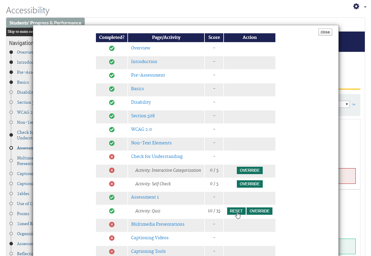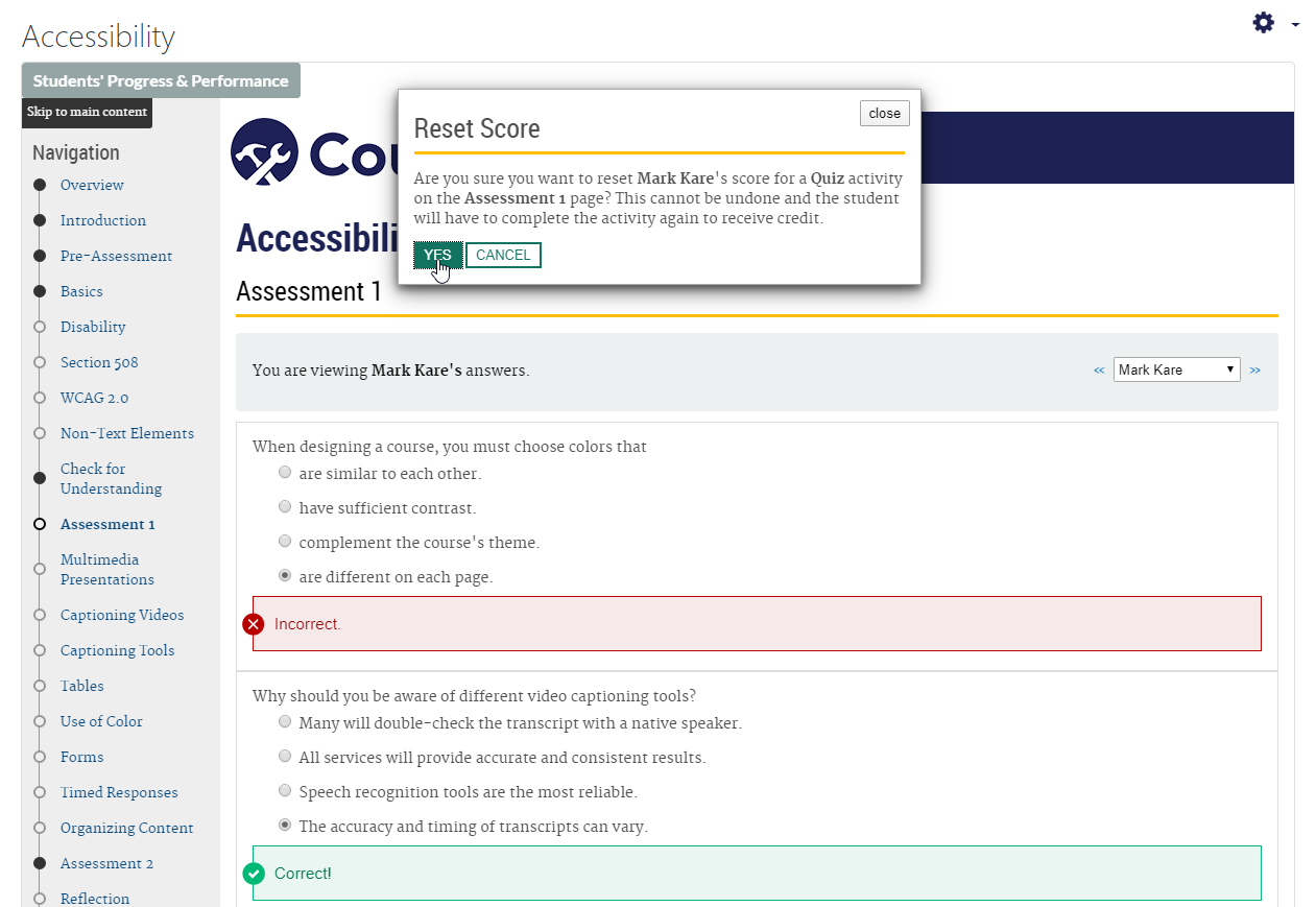 The score reset feature removes all previous student attempts for an activity allowing the student to retry the activity for a new score. This option is useful for quizzes that are set to not allow retries if an instructor needs to allow a student to make another attempt.