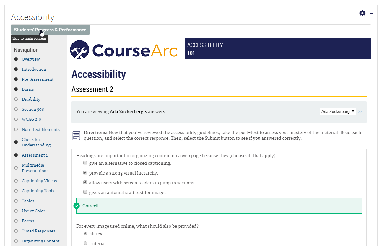 Click the Students' Progress & Performance tab in the upper left corner of the instructor course view to access the Student Progress & Performance dashboard.