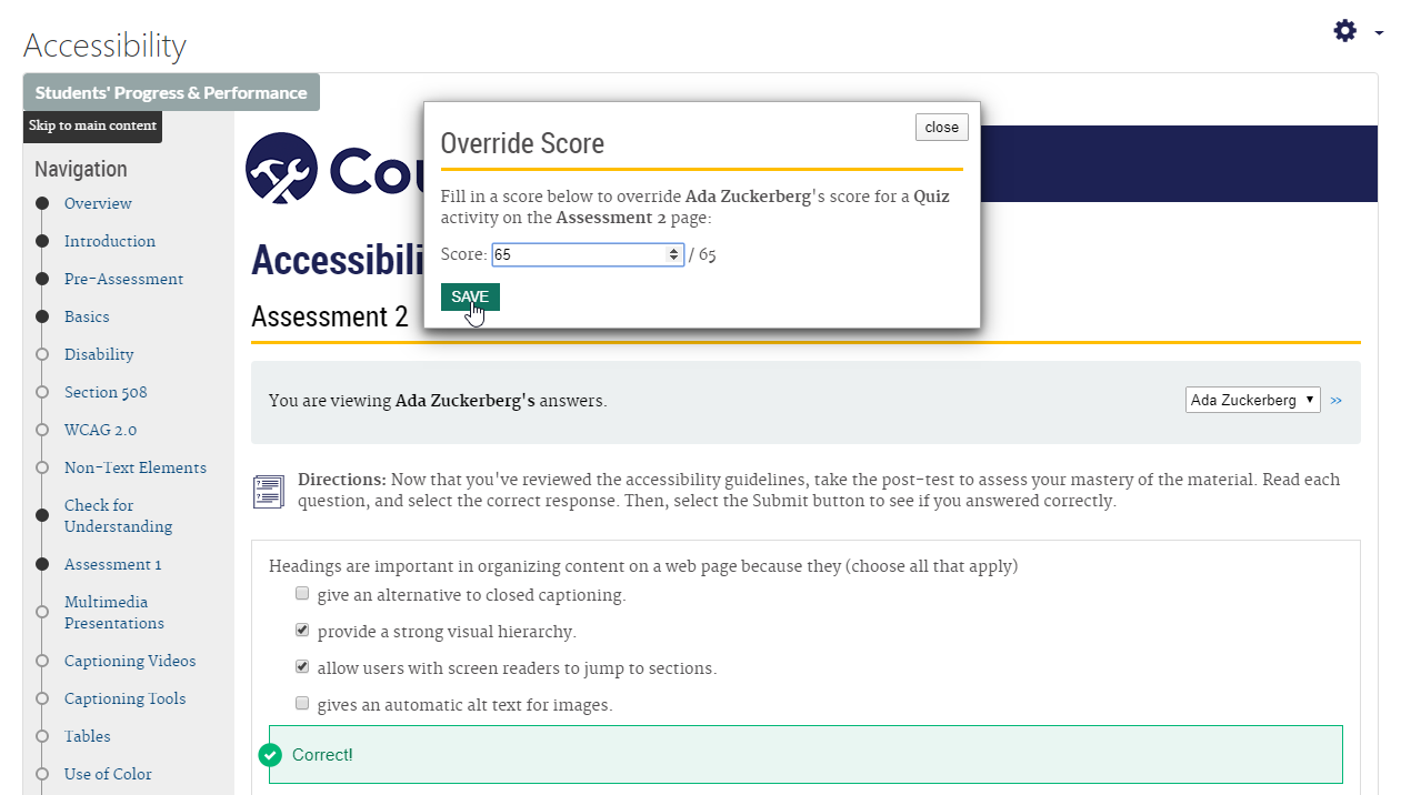 Instructors have two options to adjust student scores: score reset and score override. Score reset allows a student to redo an activity to earn a new score. Score override allows an instructor to change the points awarded for a completed activity. Both options are available in the instructor view for cumulatively scored courses via the Student Progress & Performance dashboard.