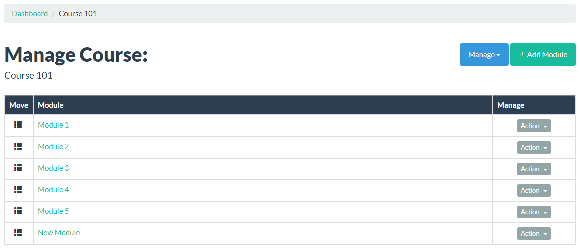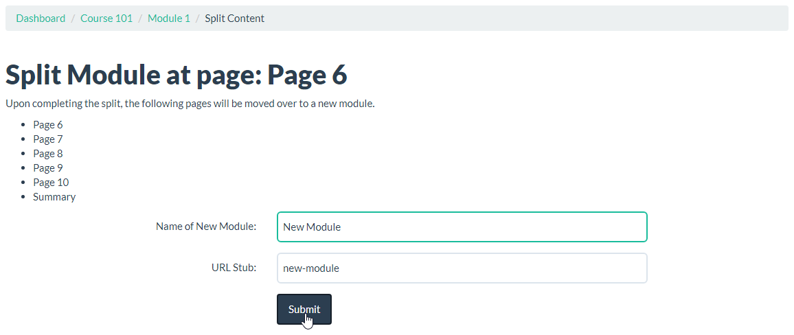- In the row of the page that will be the first page of the new module, select ⬇Split Module from the Action dropdown in the Manage column.