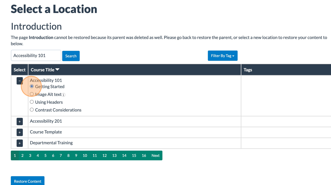 Deleted pages, modules, and courses can be restored either by the user that deleted them, or by the System Administrator. If the parent location of a delete page or module has been deleted, the content can be restored to another location.